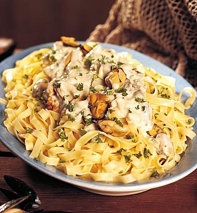 Musslor i vitlökssås med kokt pasta
