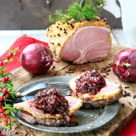 Skinkmacka med rödlöksmarmelad