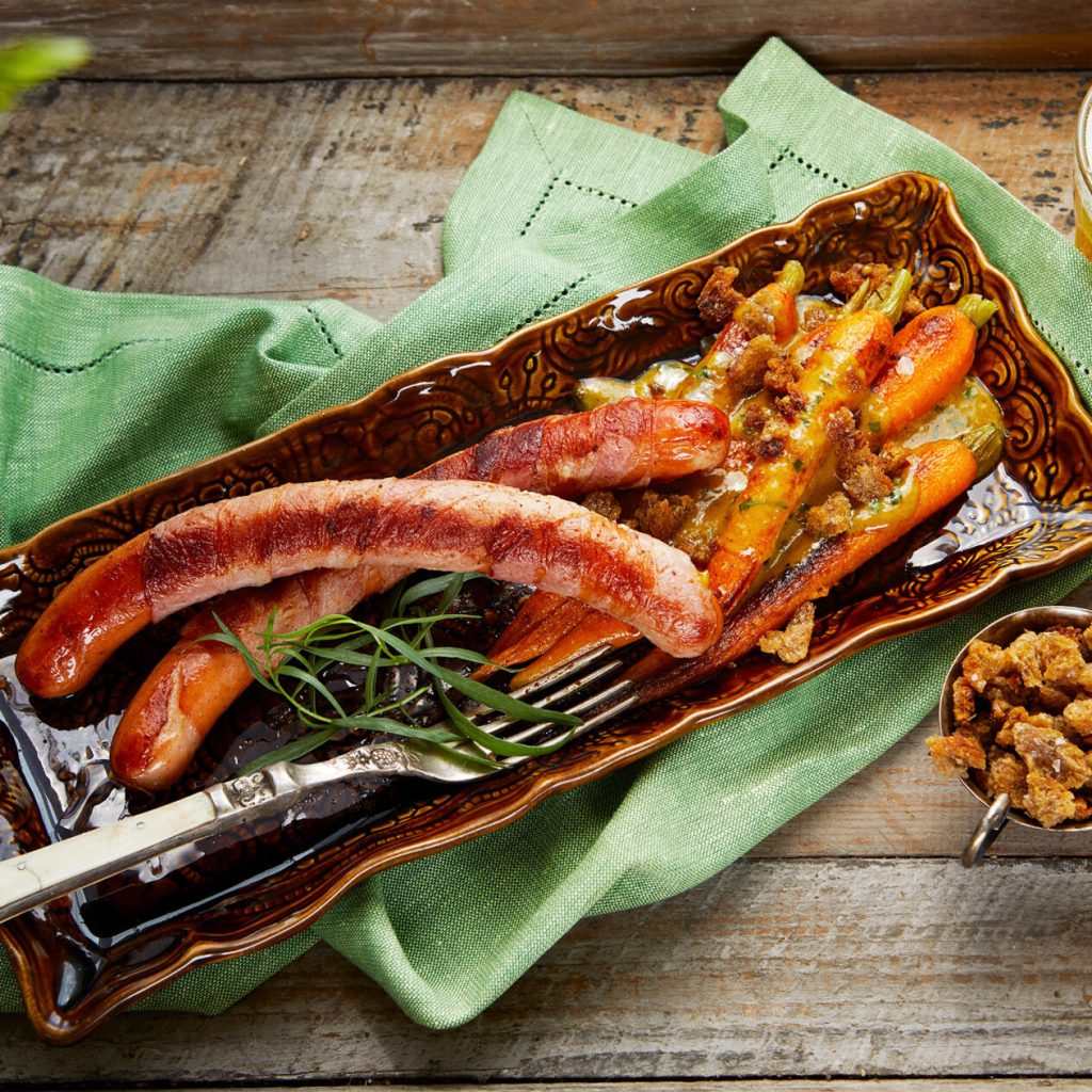 Baconlindad korv med dragonmorötter