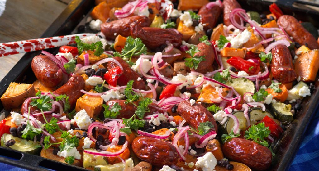 Kryddig korvplåt med sötpotatis
