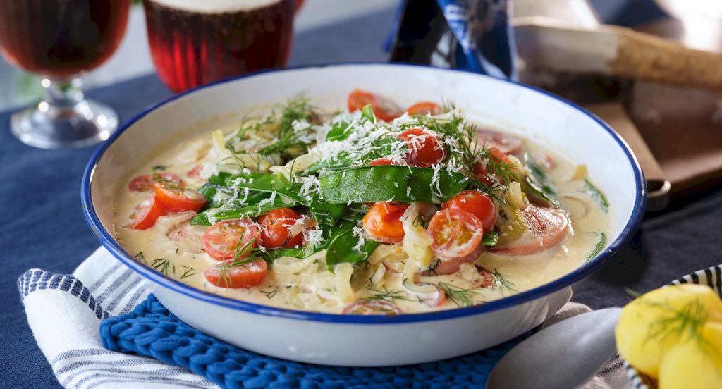 Krämig korvpanna med pepparrot och dill