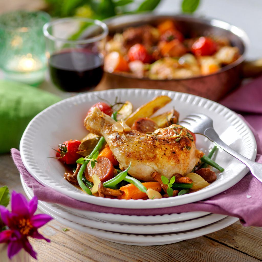 Kycklinggryta med kantareller och kryddig korv