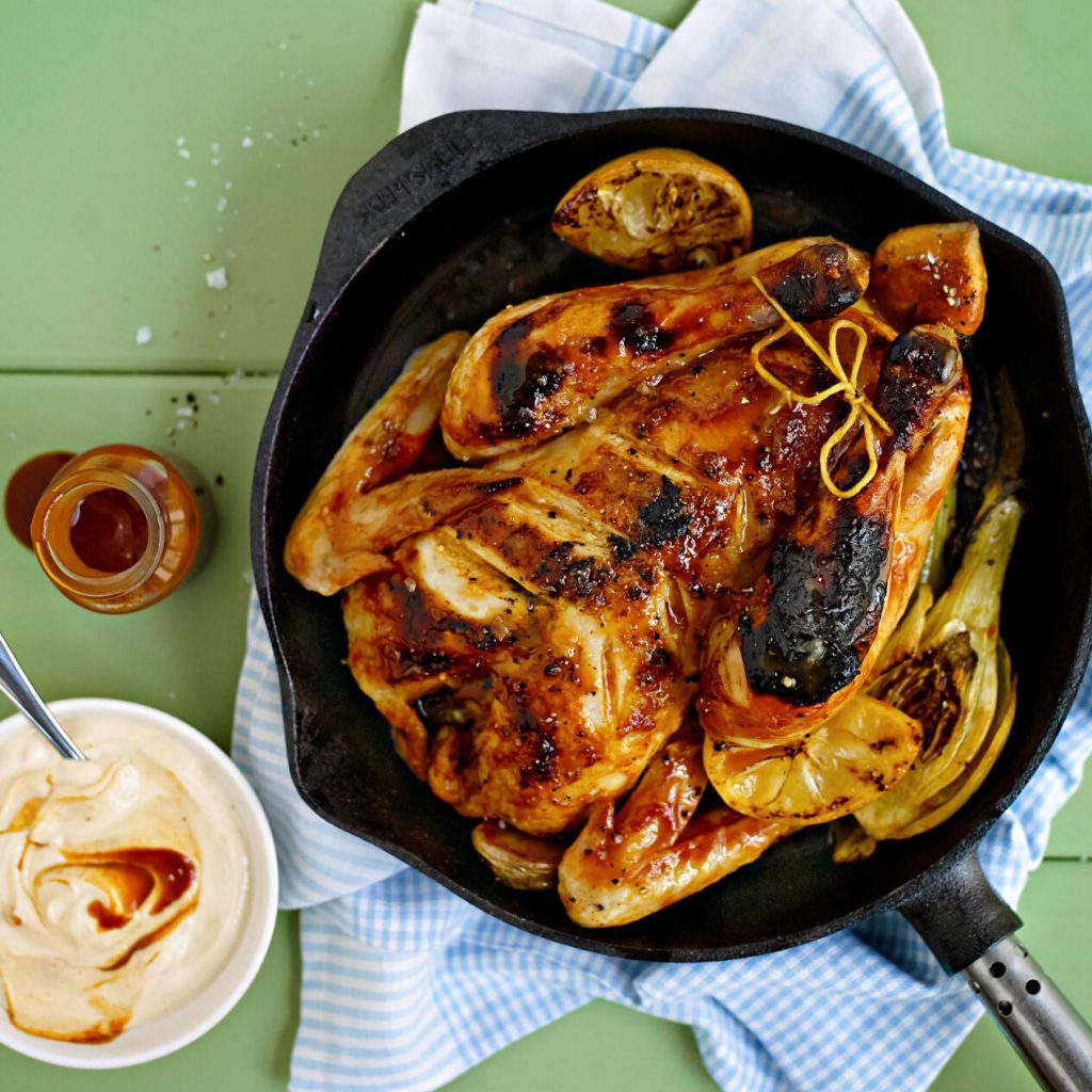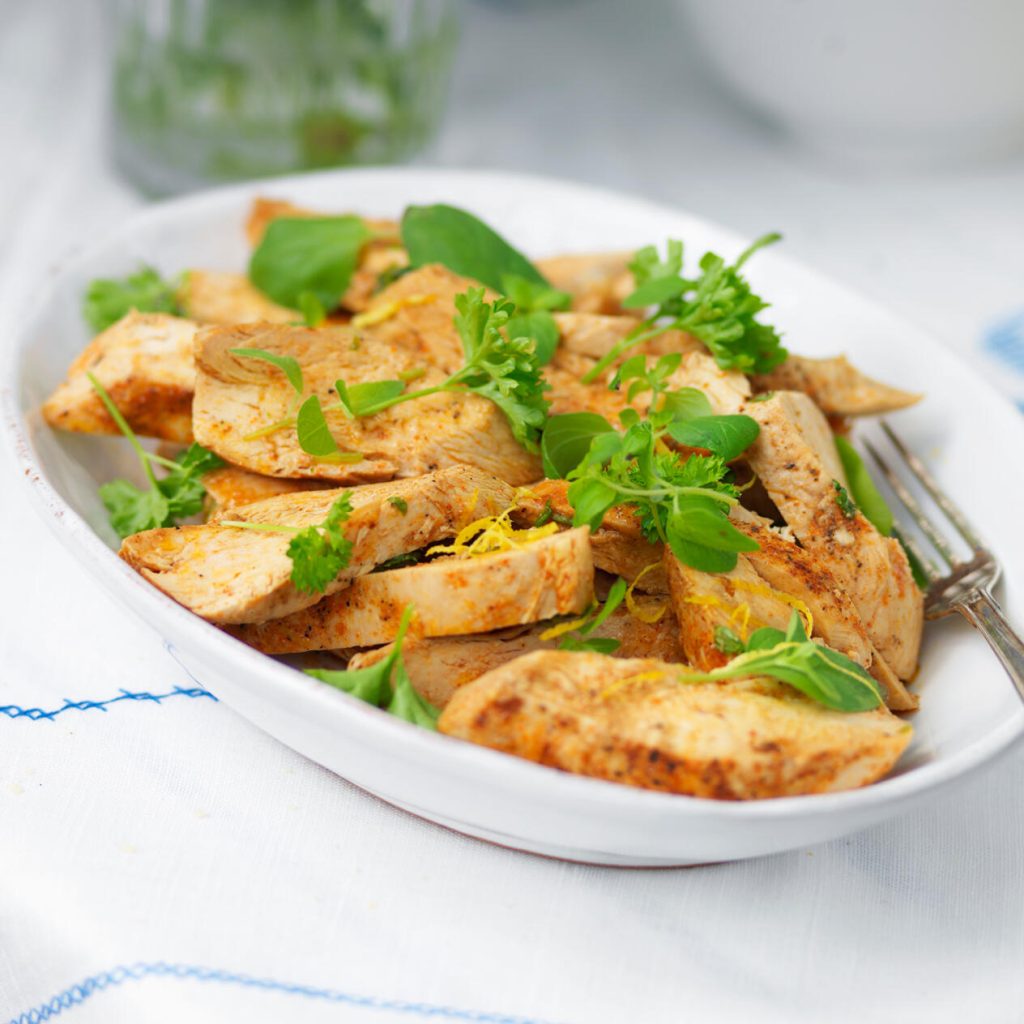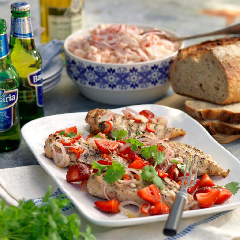 Jordgubbsmarinerad kycklingfilé med krämig pasta
