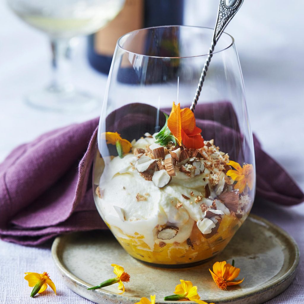 Krämig apelsindessert med nötströssel