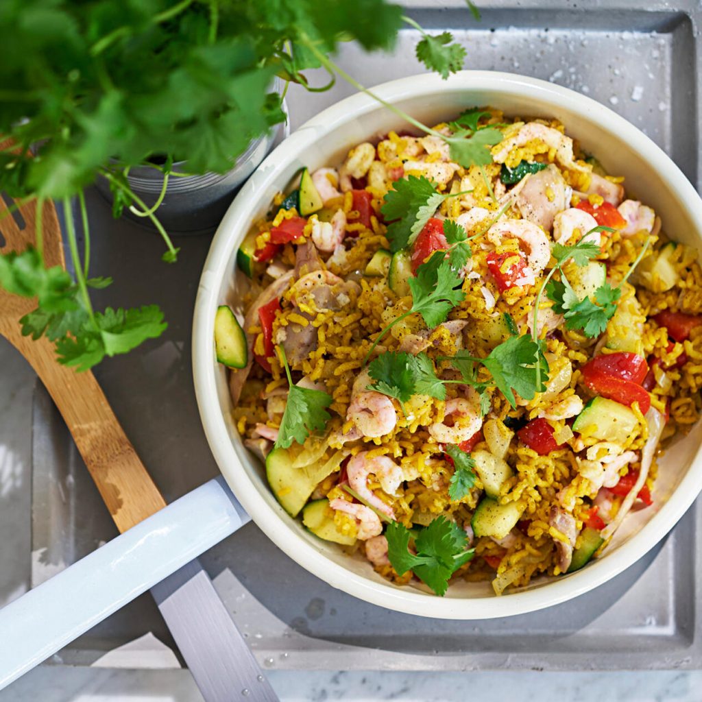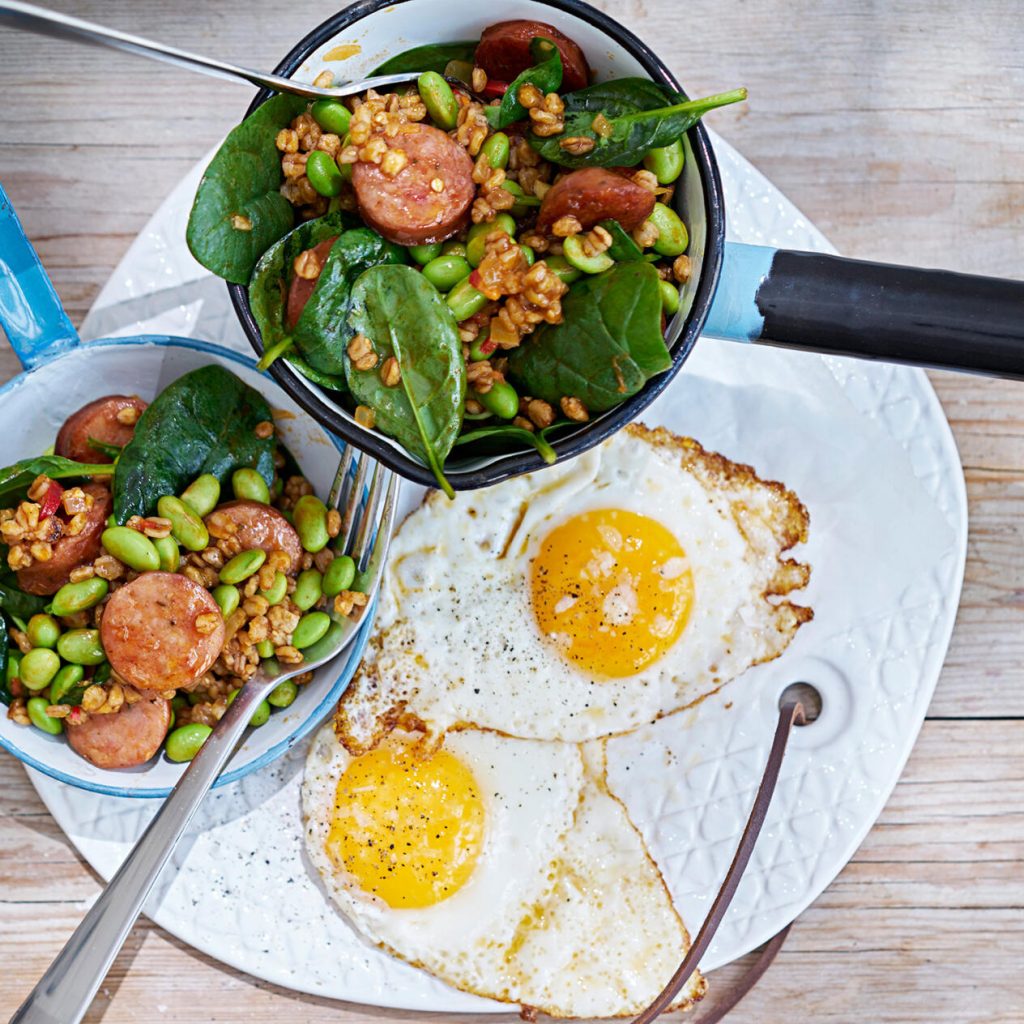Mathavrepanna med het korv och stekt ägg