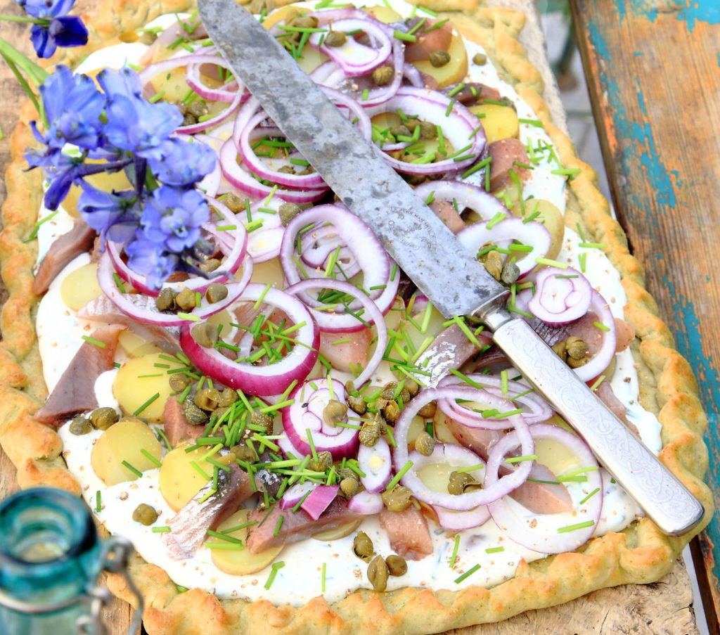 Lökpaj med ansjovis och oliver