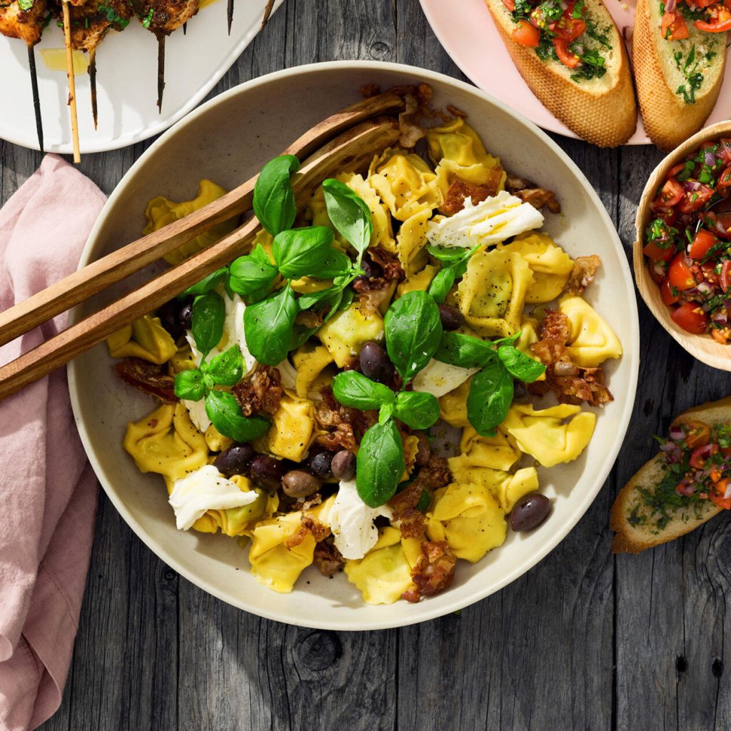 Pastasallad med fylld pasta och basilika