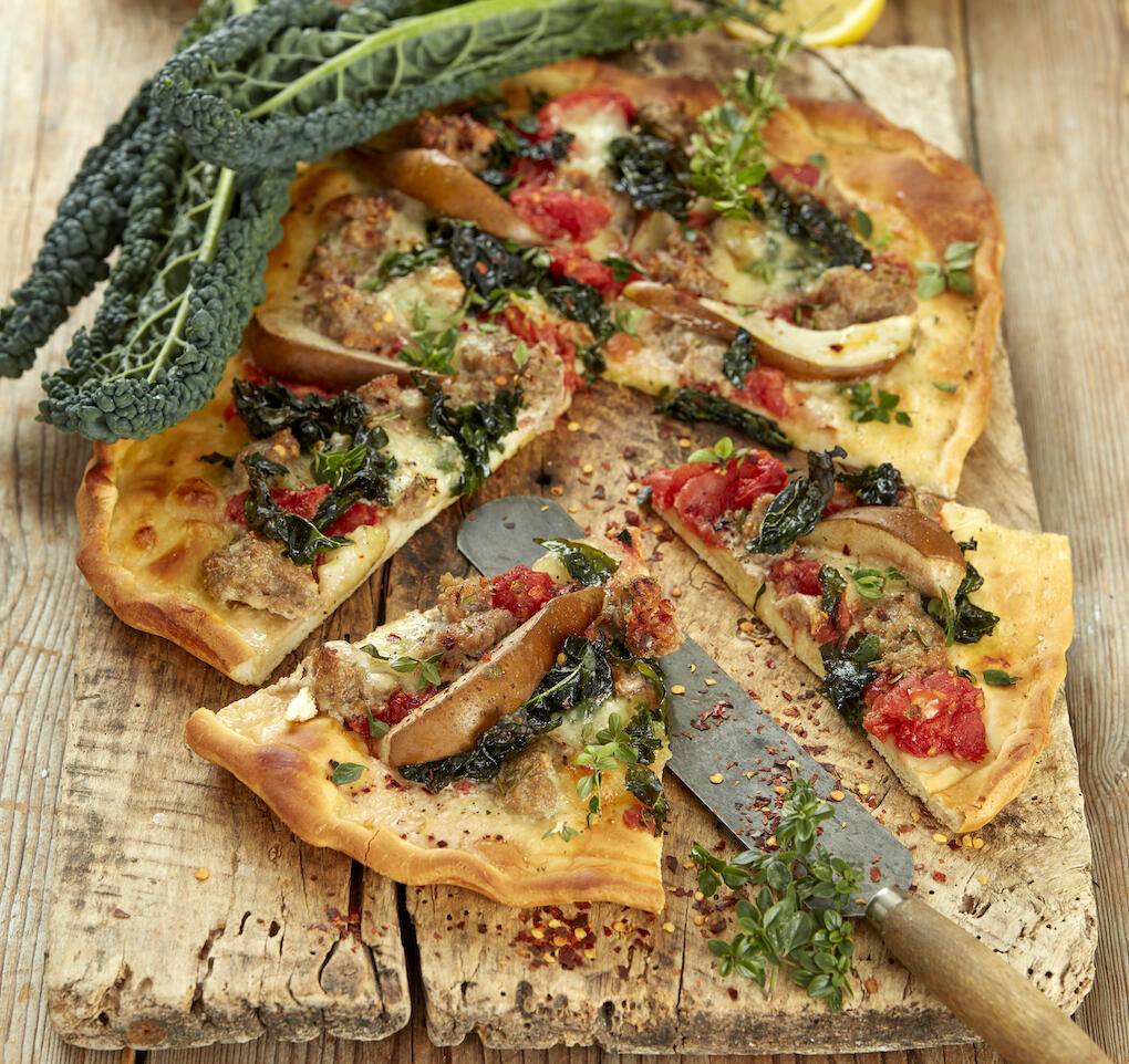 Kalvfärspizza med svartkål och päron