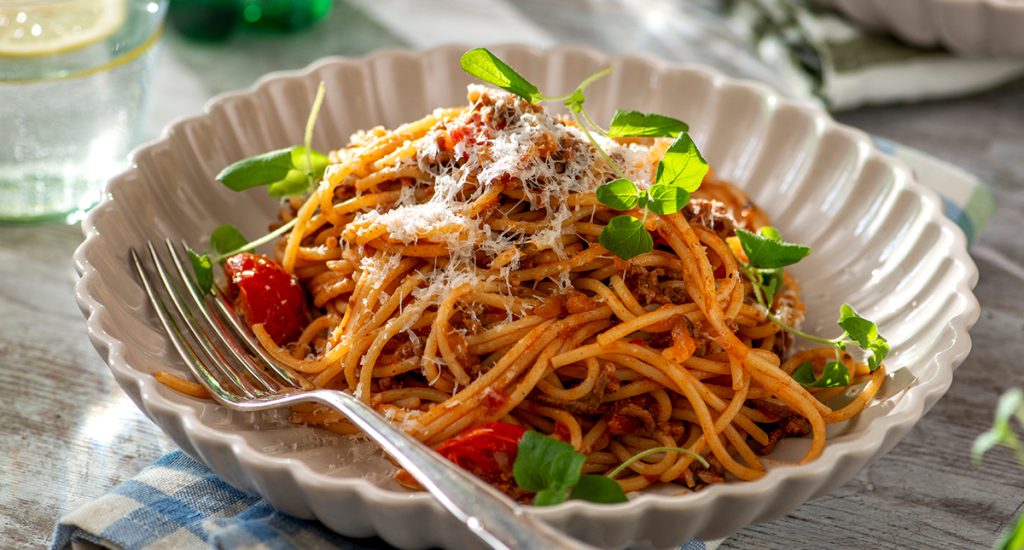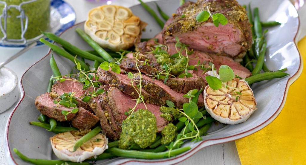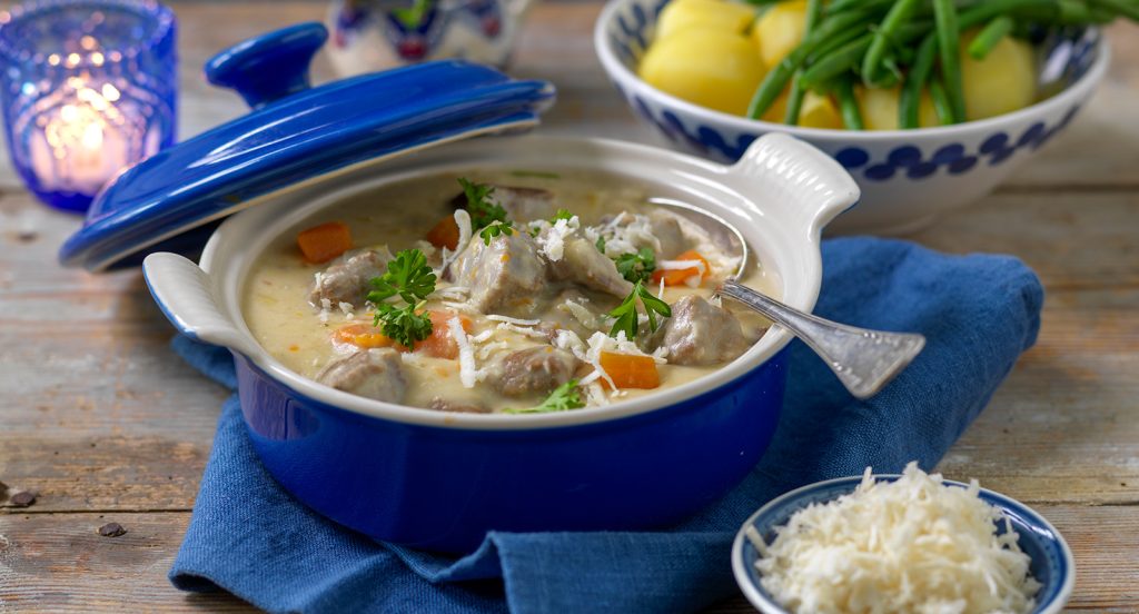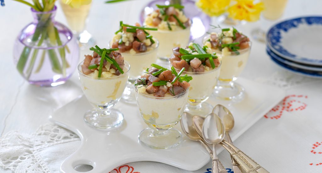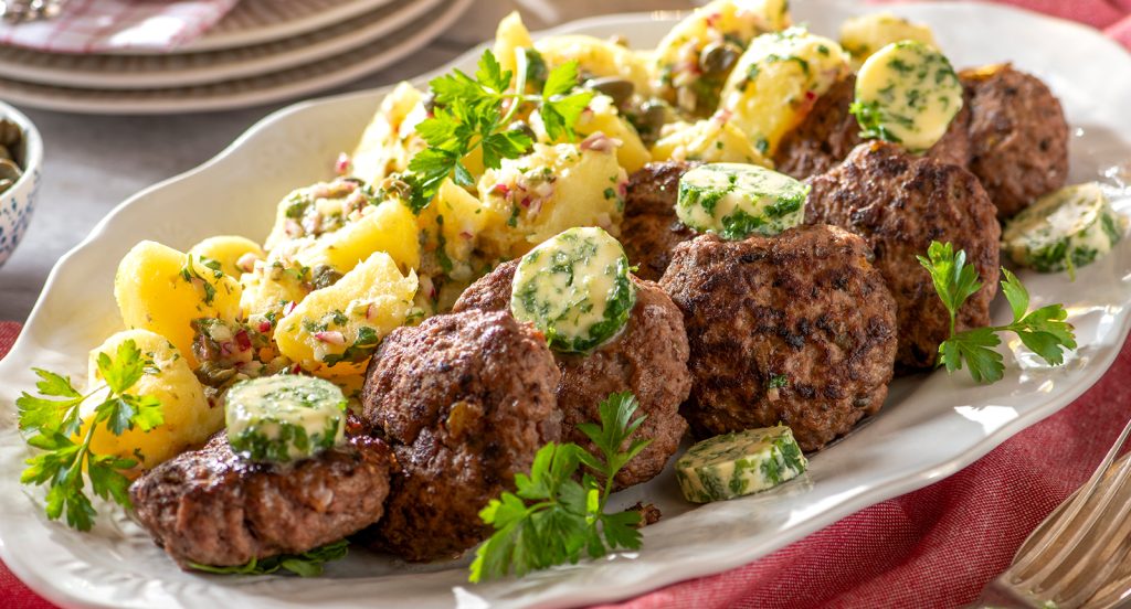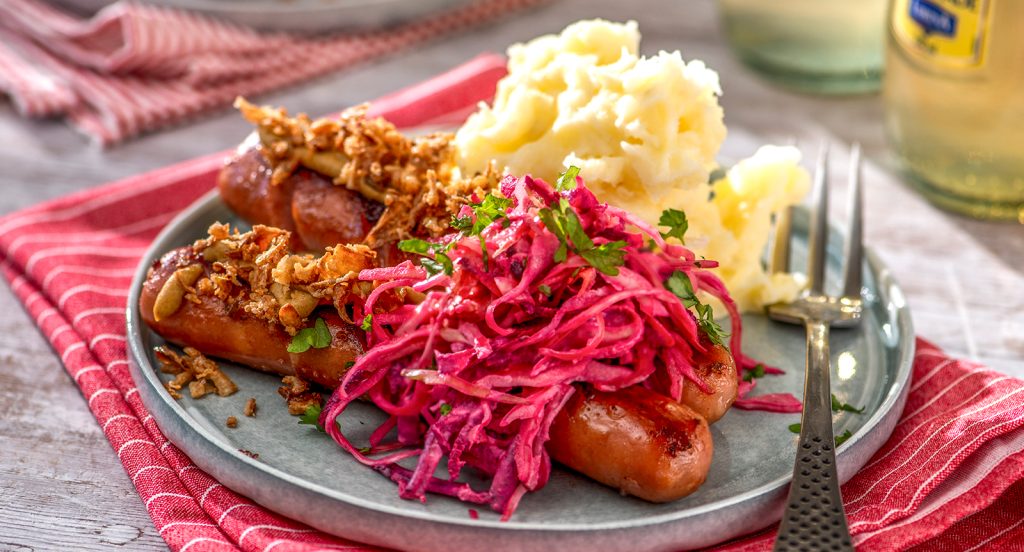 Ugnsstekt falukorv med äpple och gratinerat potatismos