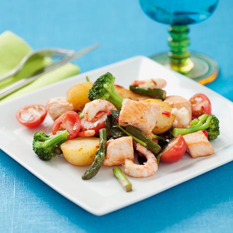 Ljummen laxsallad med räkor och sparris