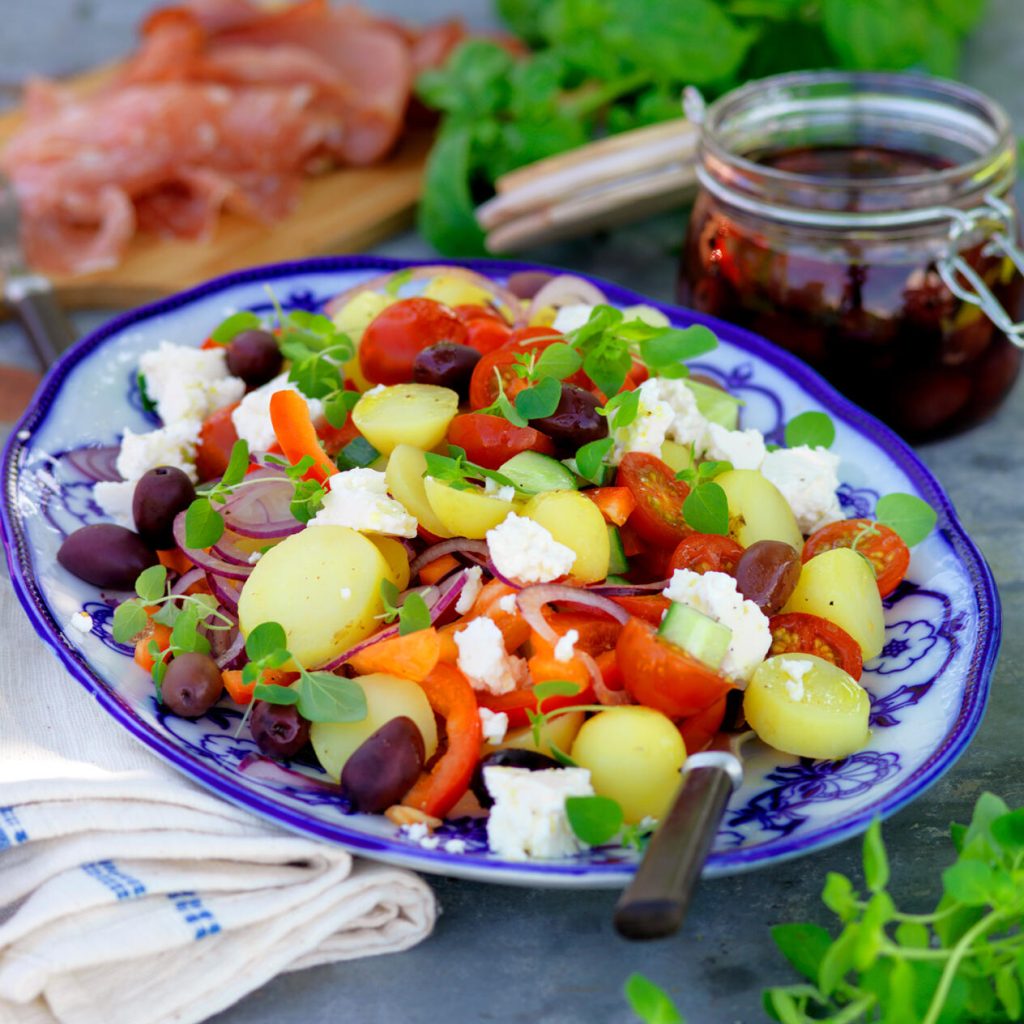 Tomatsallad med sockerärter, haricots verts och serranochips