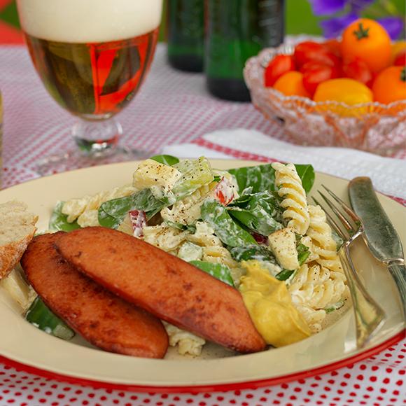 Krämig pastasallad med kryddig korv