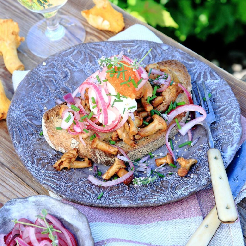 Kantarelltoast med löjrom och picklad rödlök