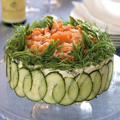 Laxtårta med löjrom och kräftstjärtar