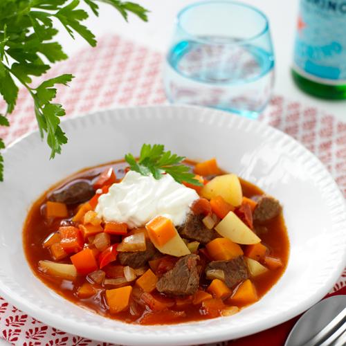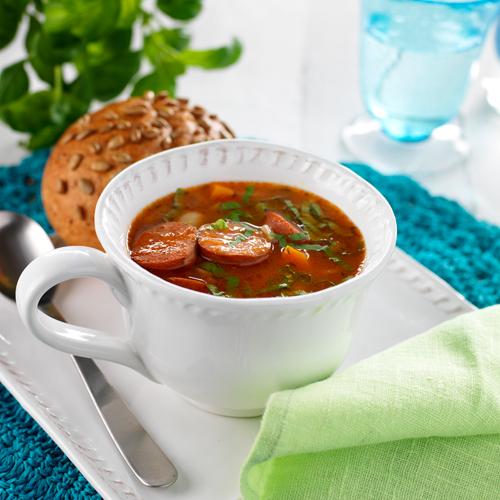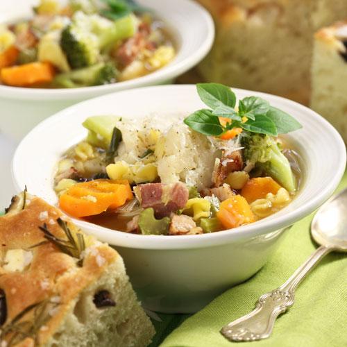 Squash- och broccolisoppa med gratinerad skink- och tomatsmörgås