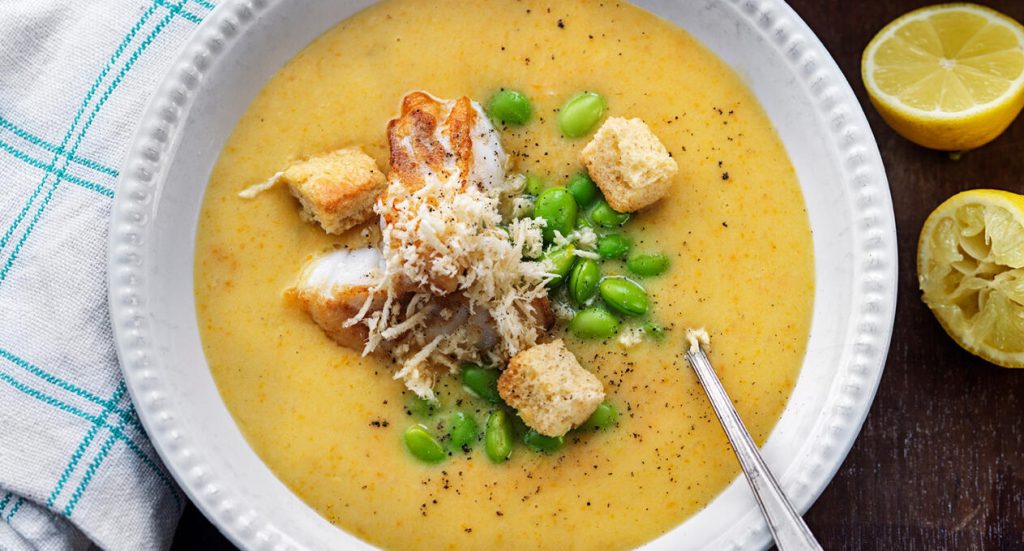 Krämig fisksoppa med pepparrot och krutonger