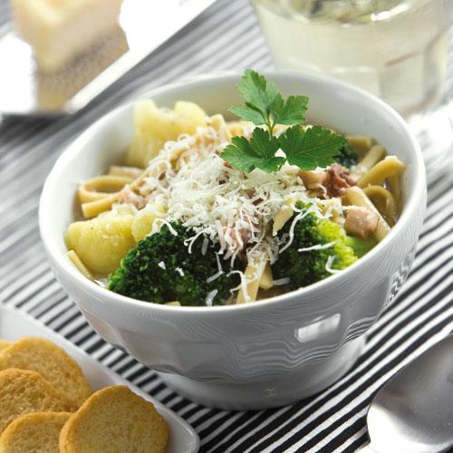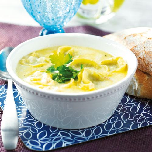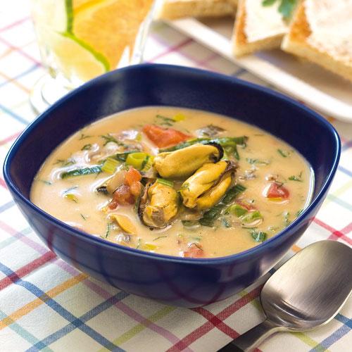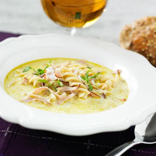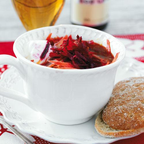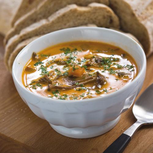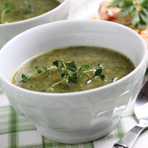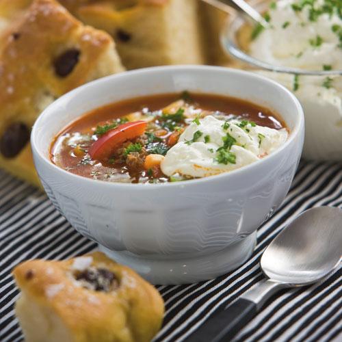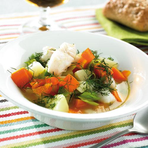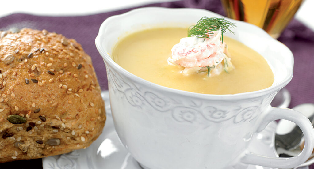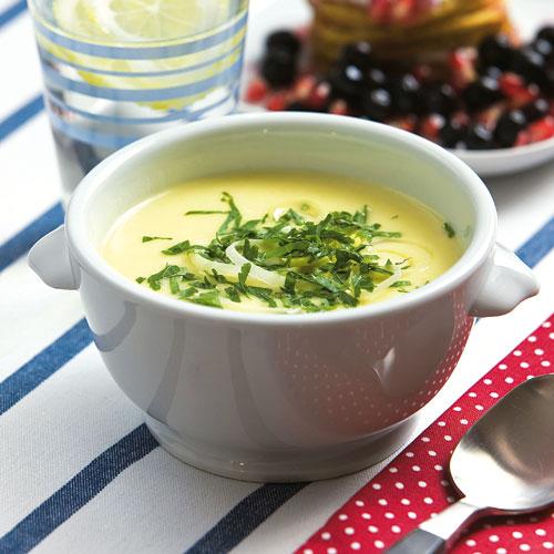 Potatis- och purjolökssoppa och plättbakelse med bär