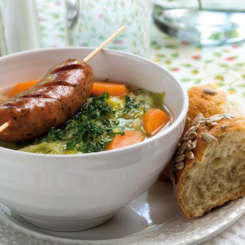 Färsk vitkålssoppa med kryddig korv