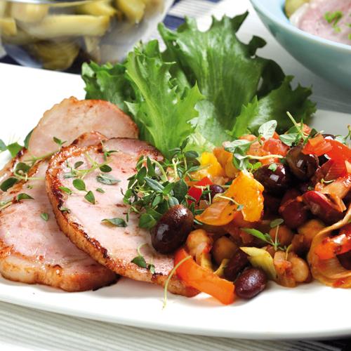 Kassler med paprika-, bön- och kikärtsröra