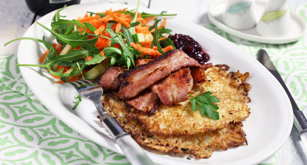 Raggmunk med stekt fläsk och morotssallad