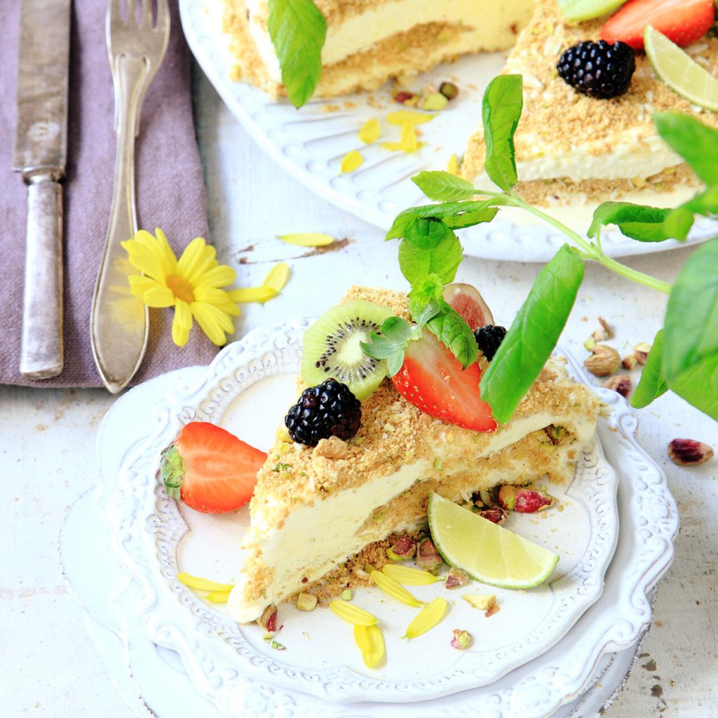 Frozen cheesecake med lime och pistaschmandel