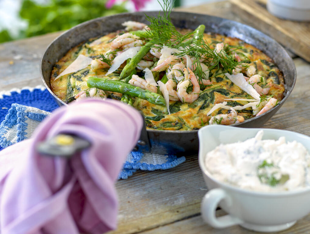 Sparrisfrittata med räktopping