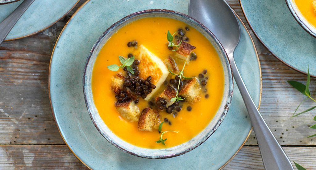 Sötpotatissoppa med grillost och belugalinser