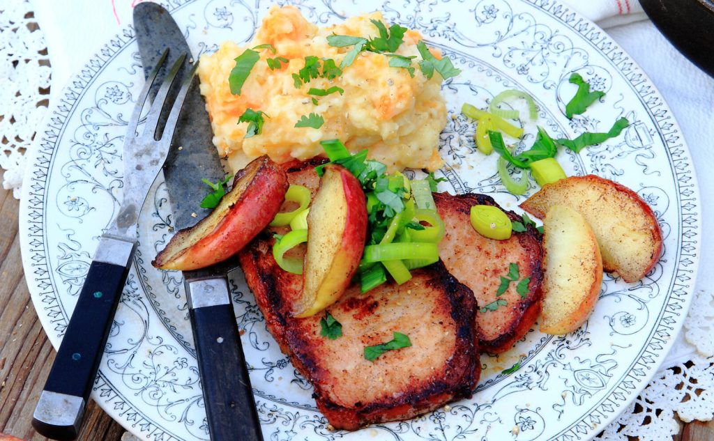 Stekt kassler med rotfruktspuré och picklad purjolök