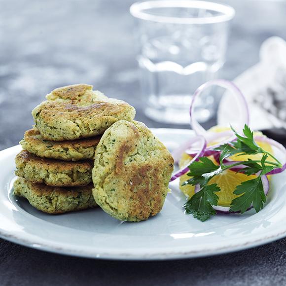 Kikärtsbiffar med apelsinsallad och vitlökssås