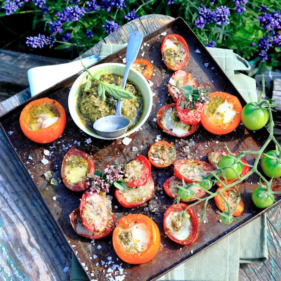 Tomater fyllda med pesto och mozzarella