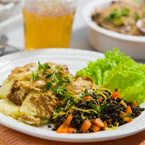 Svampgratinerade rotfrukter med marinerade linser