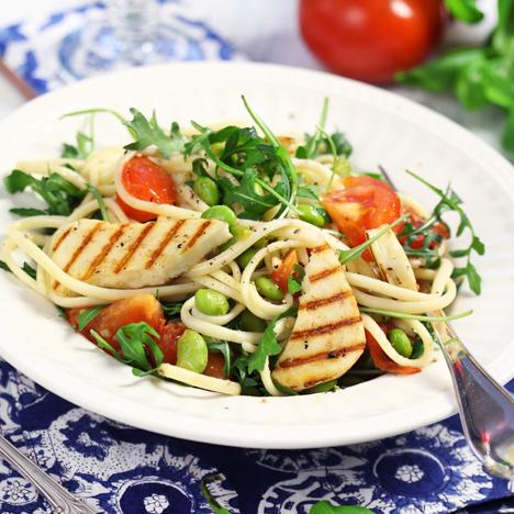 Linguine med edamamebönor och grillad haloumi