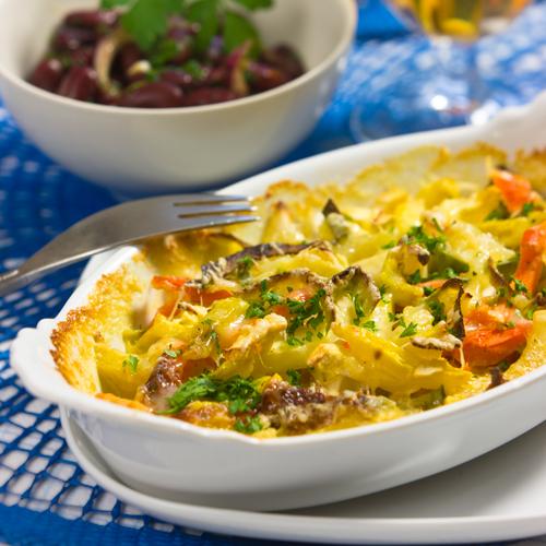 Rotfruktsgratäng med bönsallad