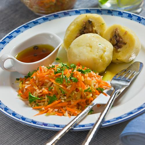 Kroppkakor fyllda med äppel- och svampfyllning med äppelsirap