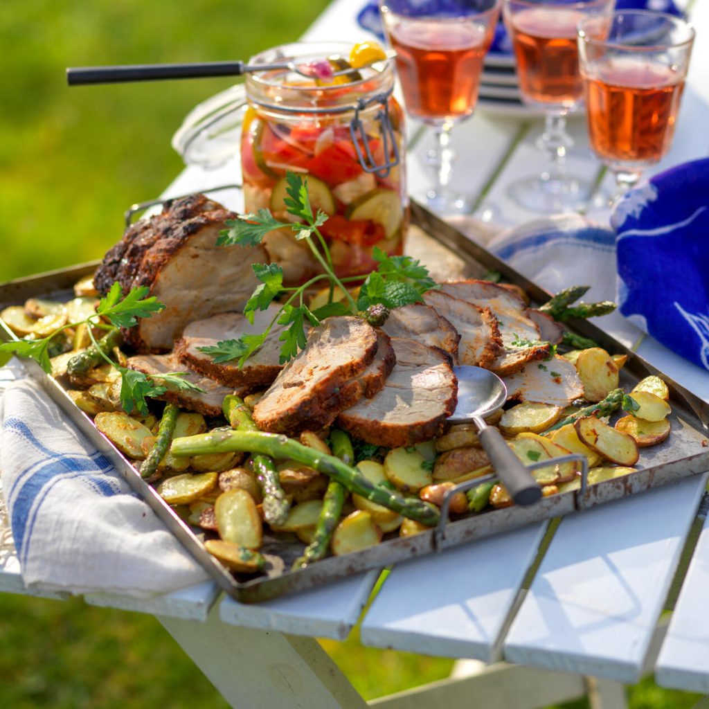 Helstekt fläskkarré med potatis- och sparrissallad