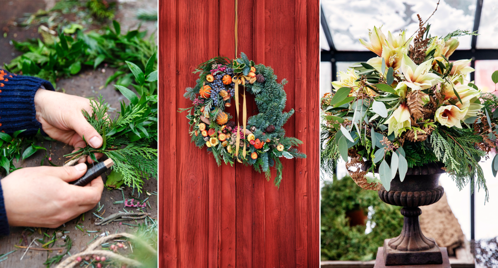 Här binder Andreas en girlang att hänga över en dörröppning eller runt ett gardinlöst fönster. Kring hampasnöre fäster han tuja, hiba och ruskus. Den sistnämnda är en klassisk utfyllnad i buketter som behåller sin gröna färg även när de torkar.