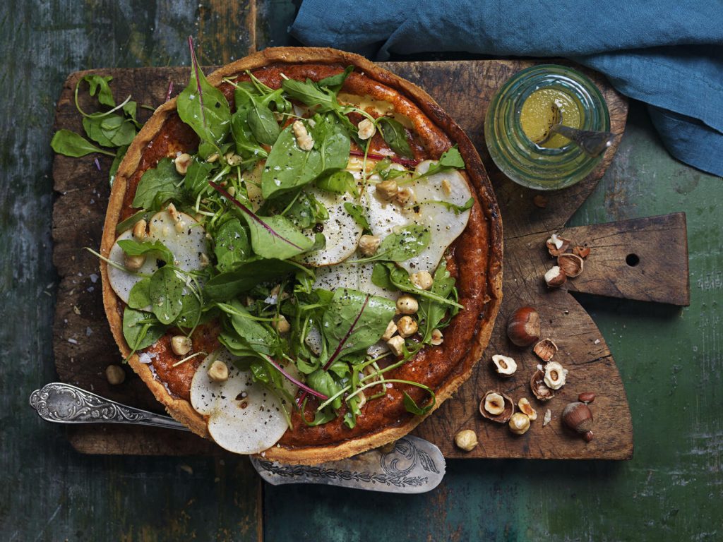 Topping Skiva päronet tunt. Toppa pajen med salladsblad, päron och nötter precis inför serveringen. Servera dressingen vid sidan av.