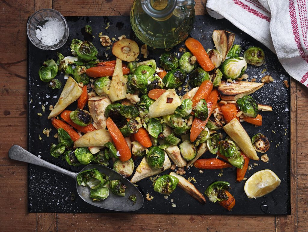 Sätt ugnen på 225 grader. Blanda rotsaker, olja, salt och peppar på papprad plåt. Rosta mitt i ugnen 20–25 minuter tills de är nästan mjuka.