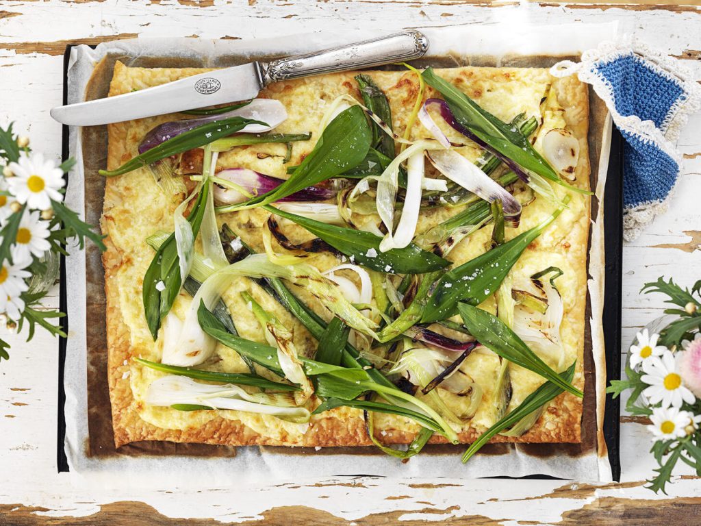 Toppa flarnen med den färska löken och garnera med ramslöken.