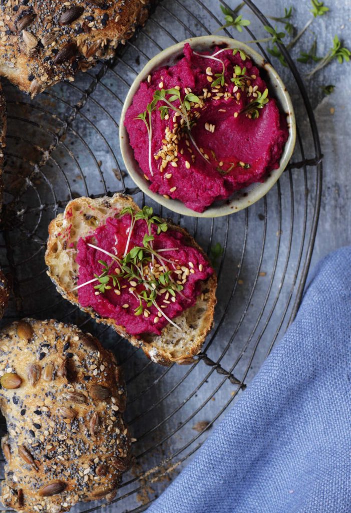 Tillsätt 2 kokta rödbetor, 1 burk (400 g) kokta avrunna kikärter och 2 msk pressad citronjuice, mixa slätt.