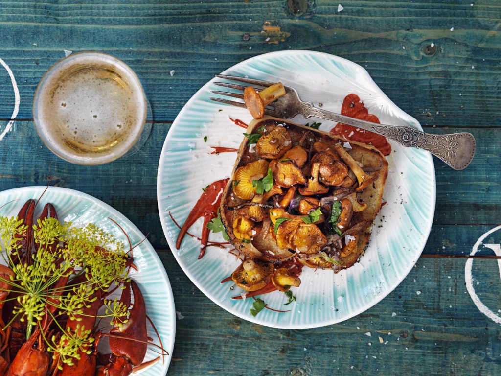 Hetta upp resten av smöret i stekpannan, fräs kantarellerna knapriga i 5–10 minuter. Blanda i löken.