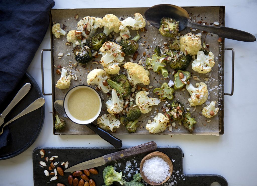 Dela blomkålen i buketter. Lägg broccoli och blomkål på en bakpappersklädd plåt.