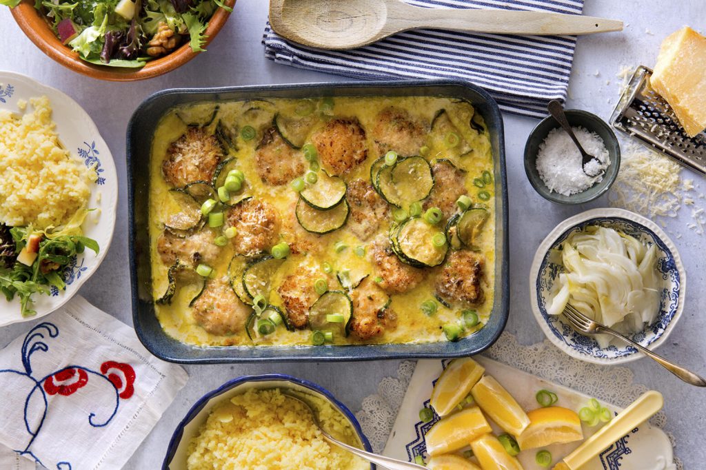 Skär squashen i tunna skivor. Stek dem mjuka i olivolja, salta. Lägg över i ugnsformen allteftersom.
