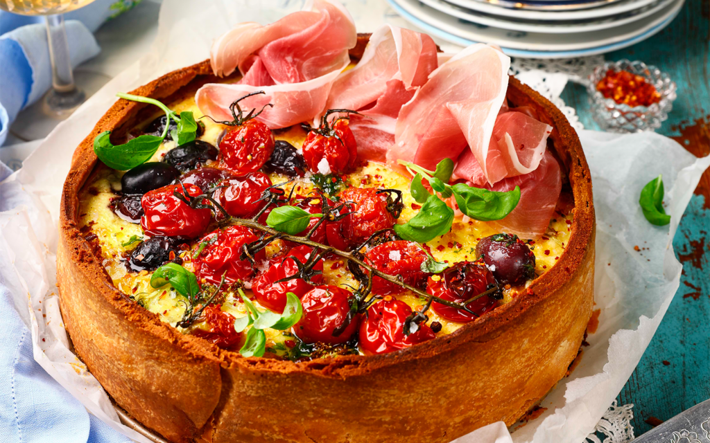 Toppa med oliver och tomater. Grädda i ytterligare ca 20 minuter eller tills stanningen stelnat och pajen fått färg.