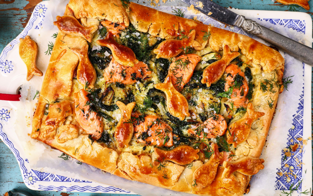 Pensla den sparade degen med ägg och stansa ut små fiskar. Lägg dem på pajen.