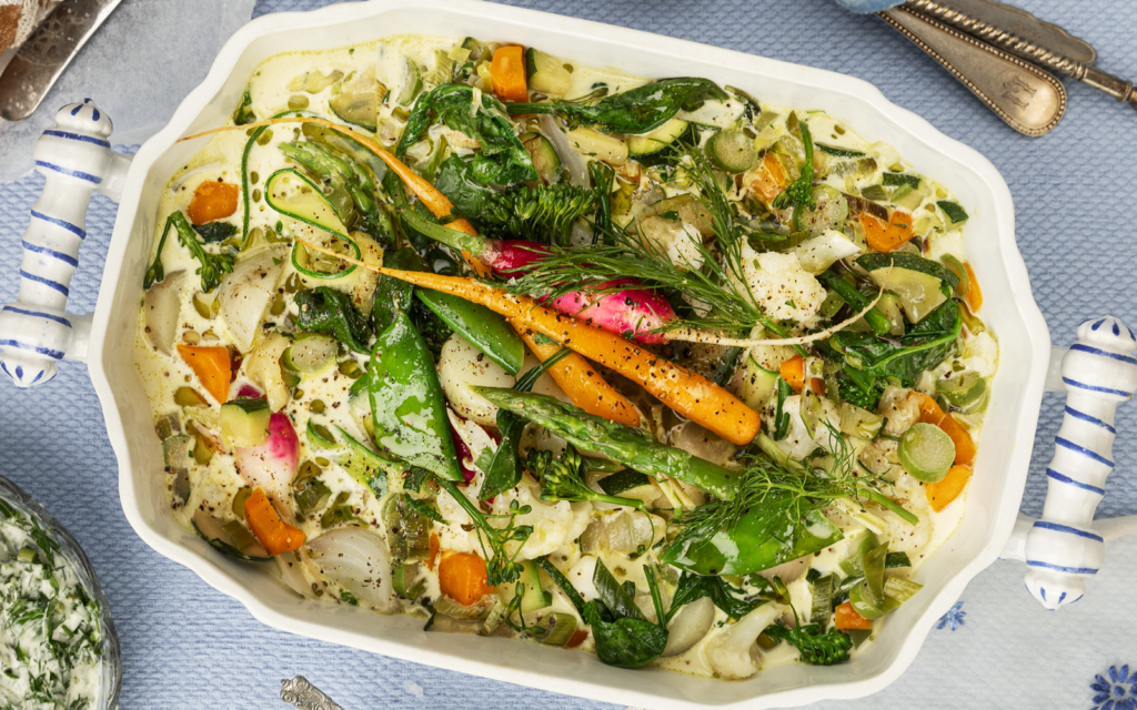 Tillsätt sparris, purjolök, spenat, sockerärtor och rädisor, koka i 3-5 minuter. Ta upp grönsakerna med en hålslev på ett fat.