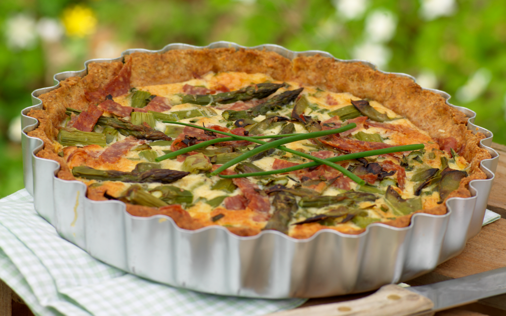 Fyllning: Bryt av nedersta biten på sparrisen och släng. Dela sparrisen i bitar och förväll i kokande vatten i 2 minuter. Låt rinna av. Lägg sparrisen i pajskalet.