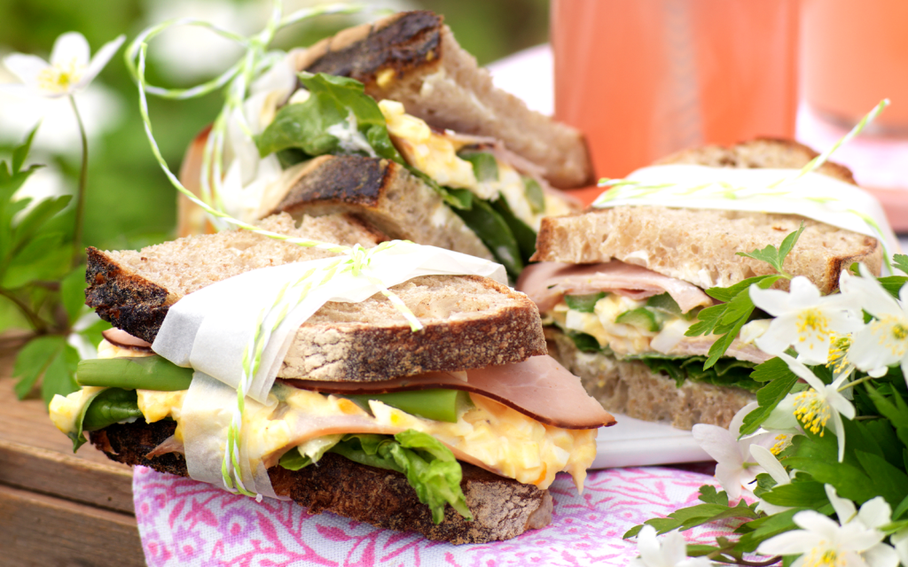 Bred färskost på brödskivorna. Lägg på sallad, skinka, äggsallad, sparris och skinka igen på två av brödskivorna. Lägg på de andra brödskivorna och tryck till.