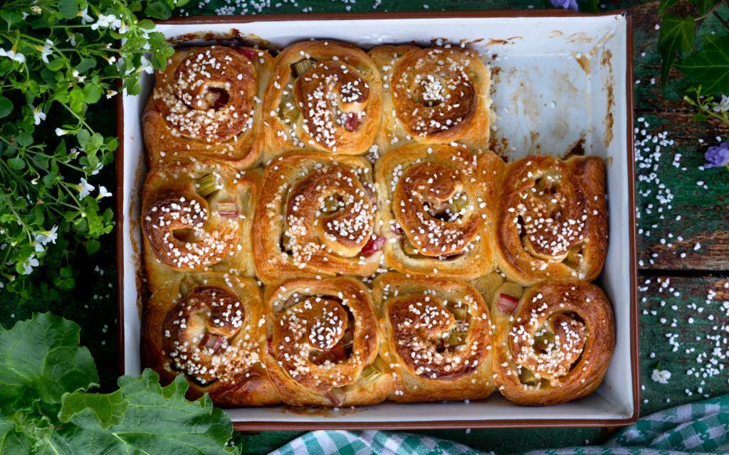 Bred hälften av fyllningen över degen. Strö på hälften av rabarberbitarna. Rulla ihop till en rulltårta och skär i 12 jämnstora bitar.