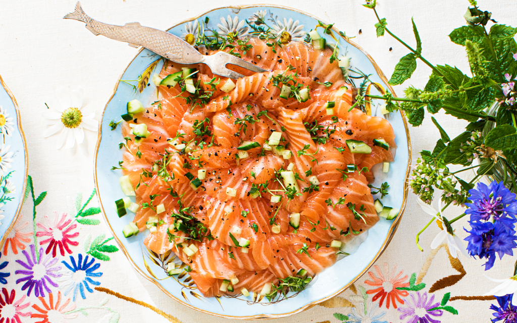 Ta bort dillen och skär fisken i tunna skivor. Lägg upp på ett fat. Peppra.